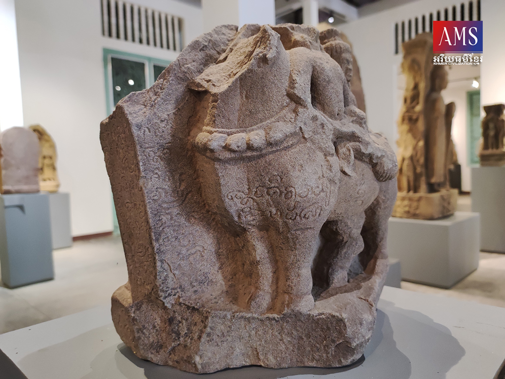 ចំណុចសំខាន់ដែលយើងនឹងលើកមកបង្ហាញនៅទីនេះ គឺអត្ថបទចារឹកដែលចារនៅលើបដិមាមួយនេះ។ សិលាចារឹកនេះចារពីរភាសា គឺភាសាខ្មែរសម័យអង្គរ និងភាសាសំស្ក្រឹត។ បើពិនិត្យតាមទម្រង់អក្សរតែម្យ៉ាង យើងអាចសន្និដ្ឋានបានថាស្ថិតនៅក្នុងអំឡុងសតវត្សទី១០ ប៉ុន្ដែតាមទម្រង់សិល្បៈ នរនាម និងតួលេខកាលបរិច្ឆេទដែលដាច់បាត់តួខាងដើម យើងអាចសន្និដ្ឋានថាចារឡើងក្នុងអំឡុងដើមស.វ.ទី១១ ក្នុងរាជ្យរបស់ព្រះបាទសូរ្យវម៌្មទី១។ តាមទម្រង់សិល្បៈរបស់ចម្លាក់នេះ គេអាចដឹងថាស្ថិតនៅអន្ដរកាលរវាងរចនាបថបន្ទាយស្រីនិងរចនាបថឃ្លាំង គឺរវាងពាក់កណ្ដាលទីពីរសតវត្សទី១០ និងដើមសតវត្សទី១១។