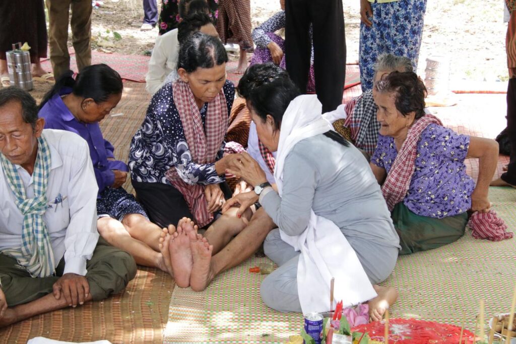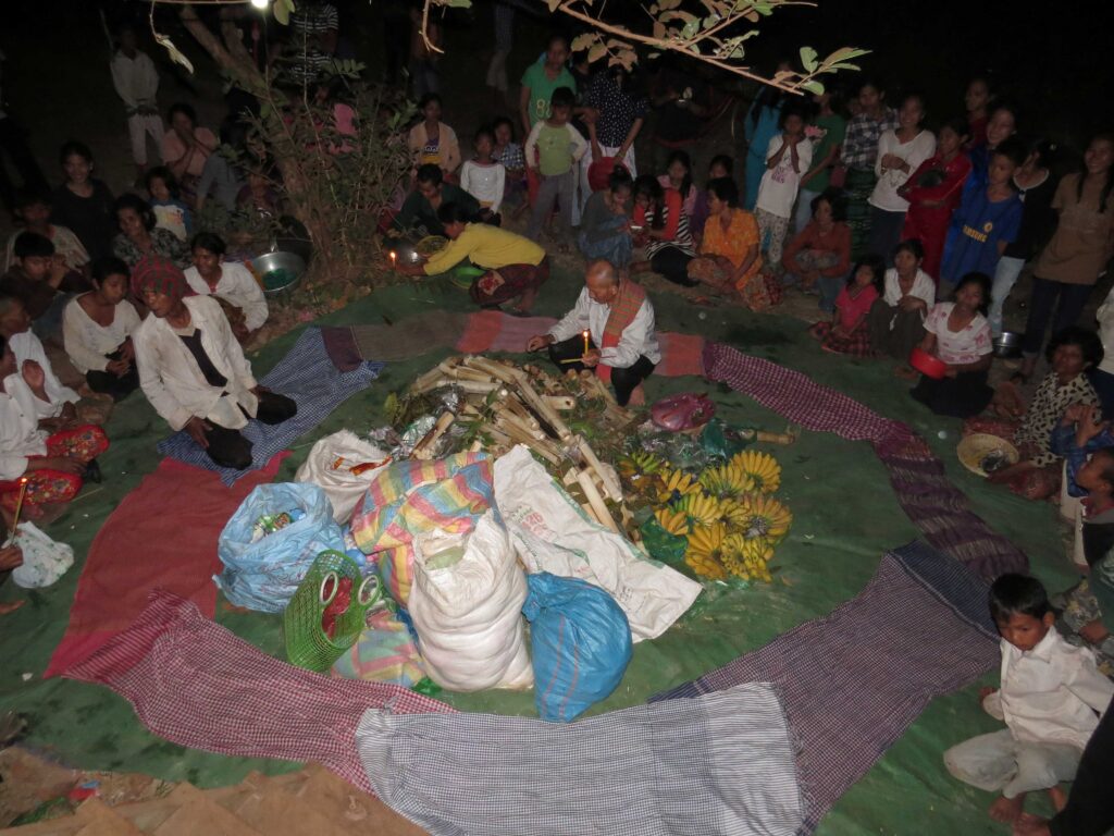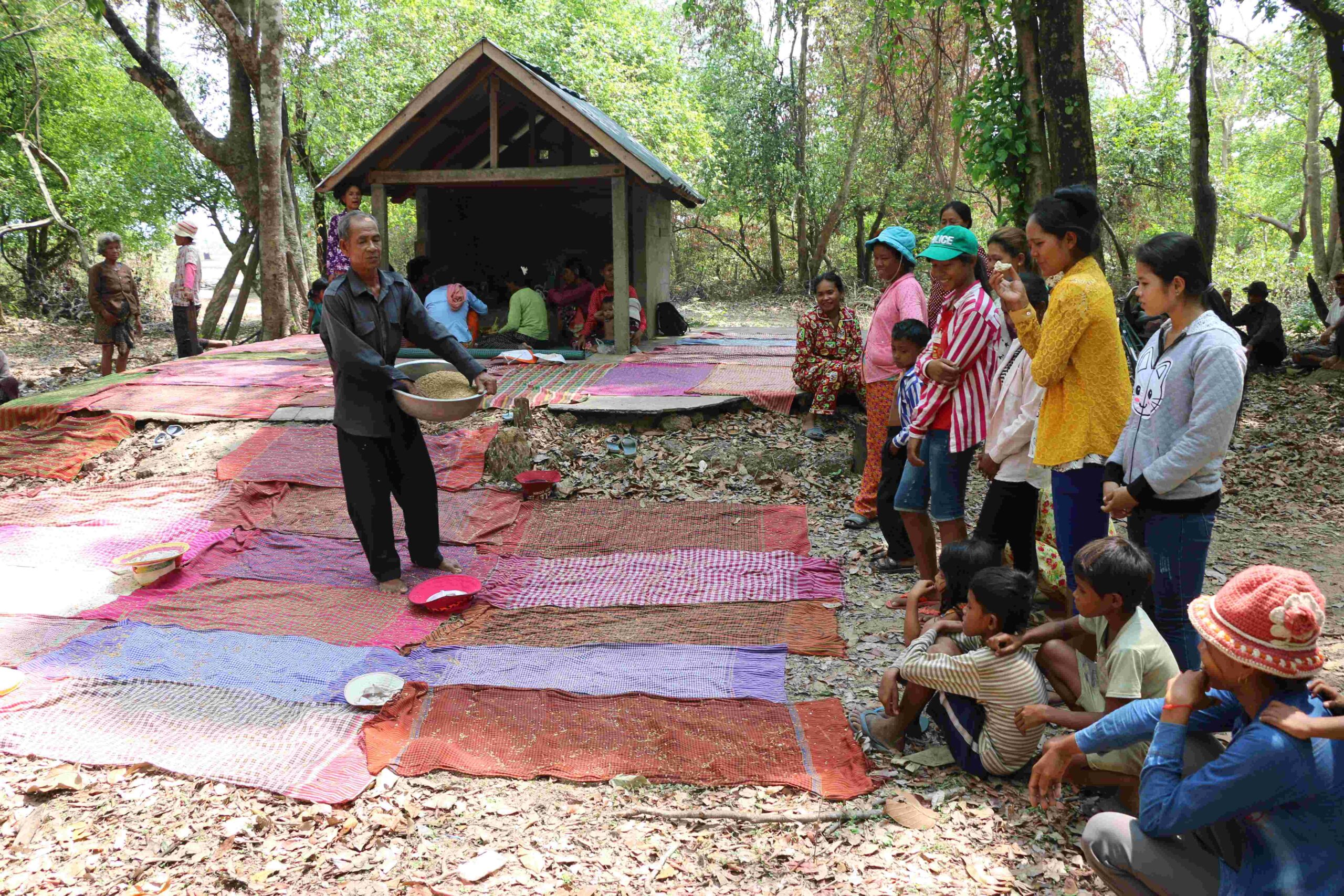 គ្នា​​ក្នុងកញ្ជីមួយ​ យកក្រមារៀង​ខ្លួនក្រាល​(អ្នកខ្លះ​ដាក់មួក)ខាងមុខ​​ខ្ទម​អ្នកតា។ បើនិយាយ​ សង្ខេប បន្ទាប់​ពី​សែនព្រេនអ្នកតាចាស់ស្រុក និងអញ្ជើញ​អមនុស្សជិតឆ្ងាយ​មកសេពសោយសំណែនរួច ​គេ​ធ្វើកិច្ច​បញ្ចូល​រូបអ្នកតា។ ពេលនោះរូបស្នងក៏ទទួល​យក​សំណែន​​សេពសោយសប្បាយ​ រួច​ចាប់យក​គ្រាប់ស្រូវ​ពីក្នុងកញ្ជីព្រាចព្រោះទៅ​​គ្រប់​ក្រមា។ បន្ទាប់ មក​​គេ​ប្រមូលស្រូវដែលធ្លាក់លើក្រមា ឬមួក​រៀងៗខ្លួន។ ស្រូវ​មួយចំណែកយក​ទៅថ្វាយអ្នកតាក្នុងខ្ទម (អ្នកស្រុកហៅថាយកចូលឃ្លាំង ឬបំពេញឃ្លាំង) ហើយមួយចំណែកទៀតគេយកទៅផ្ទះទុកនៅច្រម​សសរកន្លោង ឬកន្លែងសមរម្យណាមួយហៅថា “មេស្រូវ” ដោយ​មាន​ជំនឿថា​ឱ្យ​ស្រូវ​ឆ្នាំថ្មីដុះដាល​រាល​គុម្ពល្អ បាន​ផលបរិបូណ៍ (រូប​លេខ​១០-១១)។