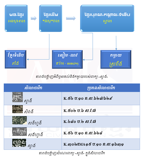 In conclusion, the word Svāṅ (ស្វាង) is of Khmer origin and belongs to the Mon-Khmer linguistic family, not Thai, as suggested by Khmer dictionaries. Thai and Lao borrowed this word from Middle Khmer.