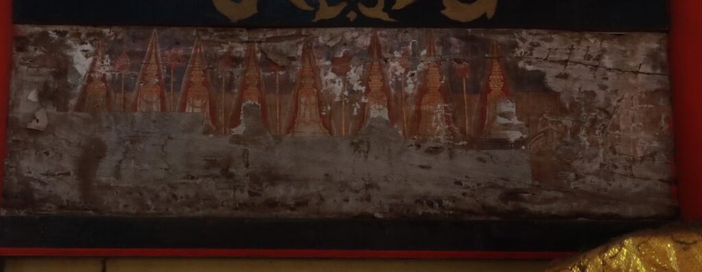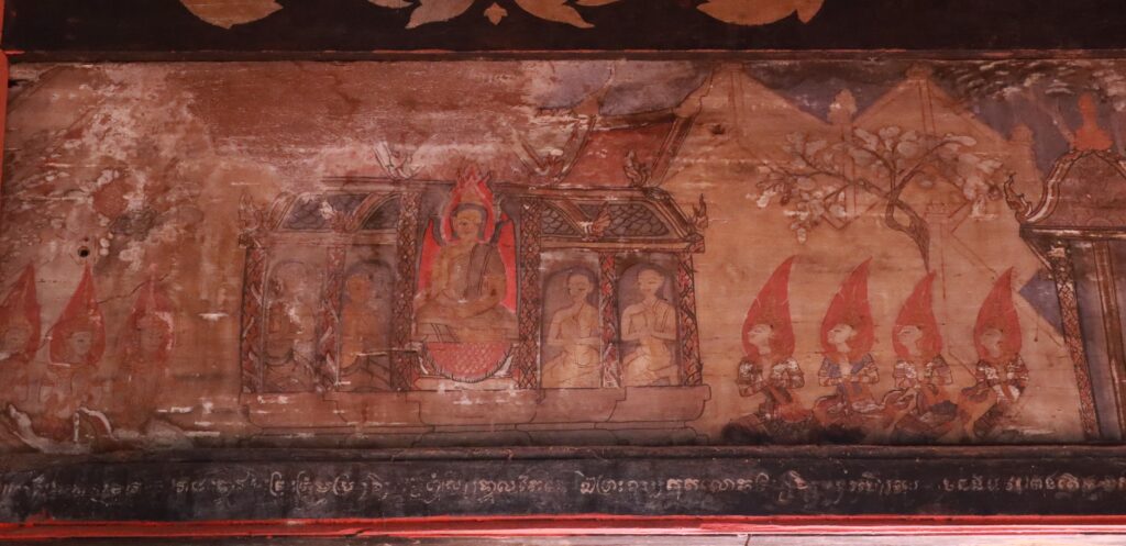 នៅផ្នែកខាងក្នុងនៃព្រះវិហារបុរាណនេះដែរ ក៏មានគំនូរសេសសល់ពីការខូចខាតខ្លះគូរនៅលើហប់ខ្យល់ ហើយគូរជាប្រភេទគំនូរបុរាណ។ អ្នកស្រាវជ្រាវ ដានីញែល និង ដូមីនិក-ព្យែរ ហ្គេរេត៍ (Danielle & Dominique-Pierre Guéret) យល់ថាគំនូរនោះជាគំនូរពុទ្ធប្រវត្តិលាយគ្នាជាមួយឈុតឆាកខ្លះៗនៃរឿងជាតក និងរឿងរាមកេរ្តិ៍នៅផ្នែកខាងក្រោម។ អ្នកស្រាវជ្រាវទាំង២យល់ថា គំនូរនេះគឺមានតែមួយគត់ក្នុងប្រទេសកម្ពុជា។ ប៉ុន្តែយ៉ាងណាក្តី សព្វថ្ងៃគេឃើញមានគំនូរនៅសល់២ផ្ទាំងស្ថិតនៅលើហប់ខ្យល់ ដែលទំនងគូរដកស្រង់ពីព្រេងកថាណាមួយក្នុងពុទ្ធប្រវត្តិ ហើយសិល្បៈគូរគំនូរបុរាណលើហប់ខ្យល់បែបនេះ គេឃើញនៅតាមព្រះវិហារបុរាណផ្សេងទៀតដូចជា វត្តចិនដំដែក (ភ្នំពេញ), វត្តពុទ្ធា (ត្បូងឃ្មុំ), និងវត្តល្វេ (កំពង់ចាម)ជាដើម។