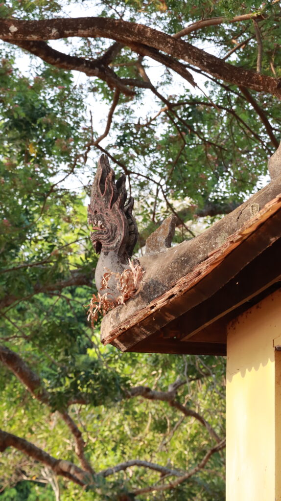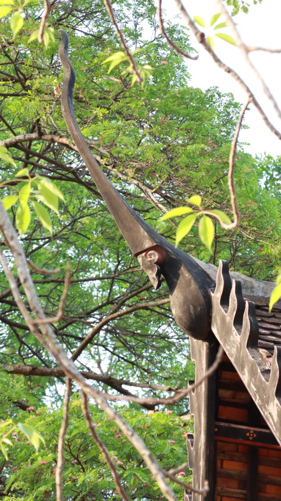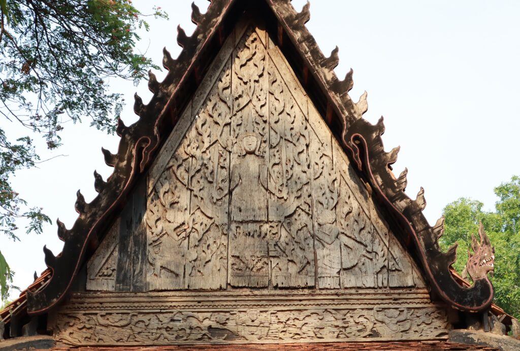 ហោជាងទាំង២នៃព្រះវិហារ ក៏សុទ្ធសឹងលម្អដោយក្បាច់ឆ្លាក់ពីឈើ។ ហោជាងមុខនិងហោជាងក្រោយឆ្លាក់រូបដូចគ្នា តែហោជាងខាងក្រោយដែលបែរទៅទន្លេ ហាក់ពុកផុយរបេះបកក្បាច់ដោយអន្លើ។ នៅផ្ទៃកណ្តាលនៃហោជាងទាំង២នេះ គេឆ្លាក់បង្ហាញរូបទេពទ្រង់ម្កុដគង់លើបល្ល័ង្ក ព្រះហស្ត៤កាន់ព្រះខ័ននិងកងចក្រជាកេតនភណ្ឌ តែនៅលើហោជាងក្រោយប្រហែលរបេះបាត់ព្រះហស្ត២ ដែលកាន់កងចក្រ។ អមបល្ល័ង្កនោះ មានរូបហនុមាន(?)កាន់ព្រះខ័នកំពុងលើកដៃប្រណមចំពោះទេពនោះ។ រីឯផ្ទៃខាងក្រោយគេរចនាជាក្បាច់ភ្ញីភ្លើង ហើយនៅគល់ហោជាងគេឆ្លាក់ក្បាច់ភ្ញីទេស រំលេចដោយរូបយក្ស និងមនុស្សកំពុងលើកទ្រហោជាងខាងលើ។