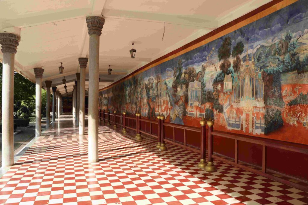 ១.ថែវព្រះវិហារព្រះកែវមរកត វត្តព្រះកែវមរកតសាងក្នុងរាជ្យ ព្រះបាទនរោត្ដម ហើយព្រះវិហារសព្វថ្ងៃសាងជាថ្មីឡើងវិញក្នុងរាជ្យ ព្រះករុណាព្រះបរមរតនកោដ្ឋ។ ព្រះវិហារនេះព័ទ្ធដោយថែវជុំវិញប្រវែង៦៤២ម៉ែត្រមានគំនូររឿងរាមកេរ្តិ៍តាមជញ្ជាំងថែវទាំង៤ទិស។ បើយោងតាមឯកសារសំណេរ ឧកញ៉ាវរវៀងជ័យ ជួន គំនូររឿងរាមកេរ្តិ៍នៅថែវជុំវិញព្រះវិហារព្រះកែវមរកត១ចប់ មាន១៩២វគ្គ តែបើស្រង់ចំណងជើងគំនូរមានរហូតដល់ចំនួន៥១១ចំណងជើង។ គំនូរទាំងនោះគូរតាមក្បួនខ្នាតគំនូរបុរាណ ជាស្នាដៃដឹកនាំរបស់ ឧកញ៉ាទេពនិម្មិត ម៉ក់ ហើយដែលគេសង្កេតសម្គាល់ឃើញជាពិសេសលើគំនូរ គឺការប្រើប្រាស់ពណ៌ជាអត្តសញ្ញាណតួអង្គនីមួយៗដូចជា ព្រះរាមប្រើពណ៌បៃតងដូចពណ៌ព្រះឥន្រ្ទ ព្រះលក្ស្មណ៍ពណ៌សាច់ឬខ្លះហៅពណ៌ស្រី ហនុមានមានពណ៌ស អង្គទពណ៌បៃតងខ្ចីកាត់ខ្មៅឬបៃតងចាស់។