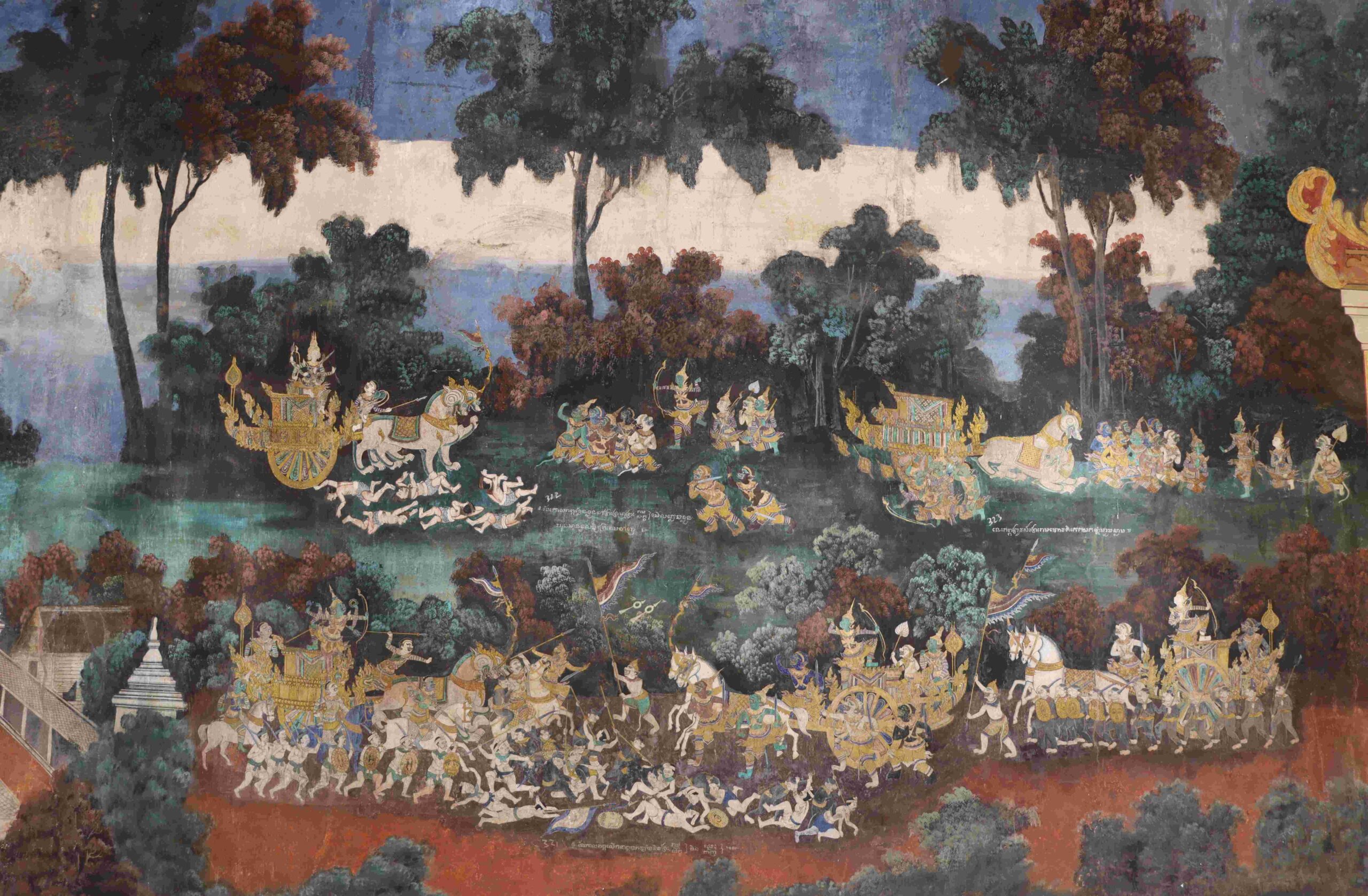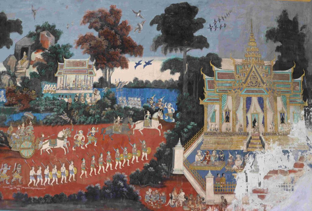 សង្ខេបសេចក្តីមក គំនូររឿងរាមកេរ្តិ៍នៅថែវព្រះវិហារព្រះកែវមរកត ព្រះវិហារវត្តរាជបូព៌ និងព្រះវិហារវត្តកំពង់ត្រឡាចលើ ពិតជាគំនូរបុរាណដ៏វិចិត្រនៃសិល្បៈខ្មែរ។ ប៉ុន្តែគំនូរនៅថែវព្រះវិហារព្រះកែវមរកត លោកគូរបង្ហាញលម្អិតសាច់រឿងវែងអន្លាយ។ រីឯគំនូរនៅព្រះវិហារវត្តរាជបូព៌ លោកព្យាយាមគូរបង្ហាញសាច់រឿងក្នុងផ្ទៃតូចៗ ដោយមានបញ្ចូលបន្ថែមទិដ្ឋភាពសង្គមជាក់ស្តែងច្រើន។ ចំណែកនៅព្រះវិហារវត្តកំពង់ត្រឡាច គឺពុំមានសាច់រឿងវែងឆ្ងាយឡើយ ពោលគឺលោកបង្ហាញតែតួអង្គខ្លះប៉ុណ្ណោះ៕