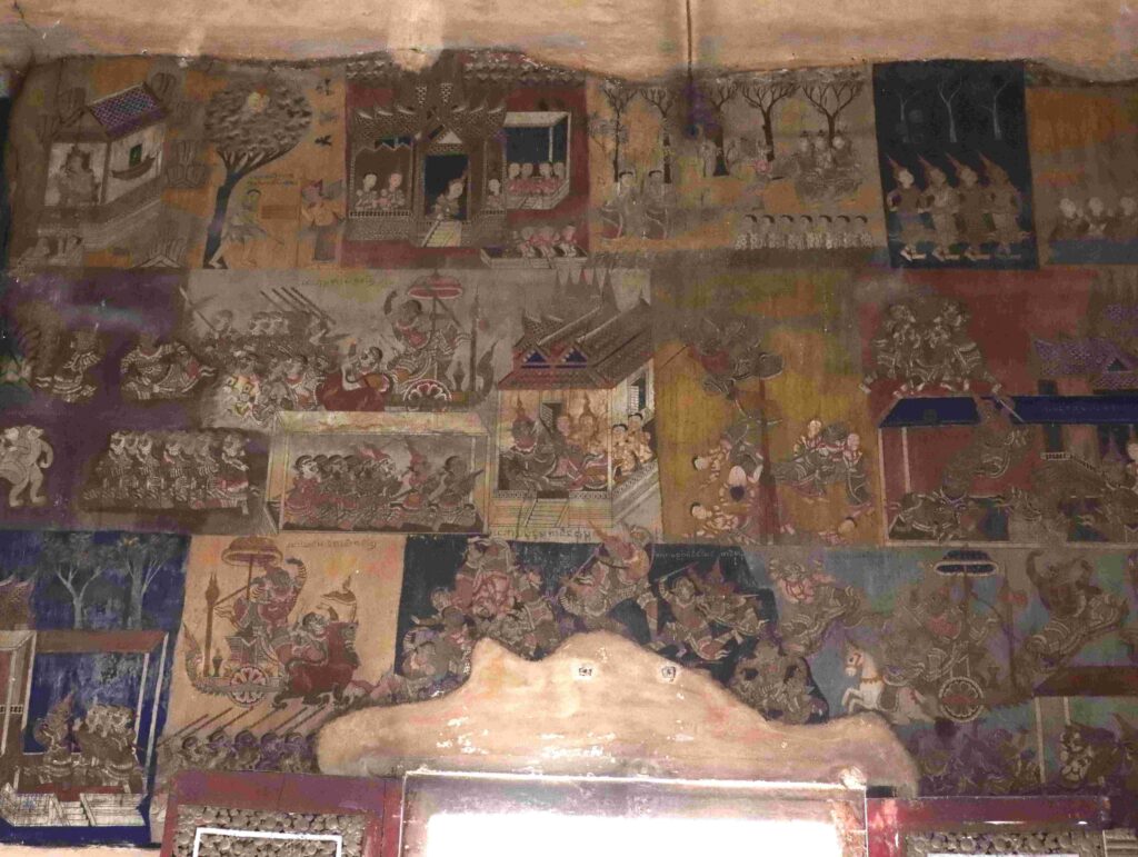 ផ្ទៃរឿងត្រង់អន្លើនានាជាទូទៅ លោកគូរបង្ហាញអំពីសង្រ្គាមរវាងព្រះរាម និងក្រុងរាពណ៍ ដោយមានព្រះលក្ស្មណ៍ ហនុមាន និងពលស្វា ប្រយុទ្ធជាមួយទ័ពយក្សយ៉ាងគគ្រឹកគគ្រេង ទាំងលើដី ក្នុងព្រៃភ្នំ សមុទ្រ និងលើអាកាស។ ទន្ទឹមនឹងនោះក៏មានអន្លើខ្លះគូរពីដំណើររឿងភ្ជាប់នឹងចំណារខ្លីៗ ឬលោកគូរបញ្ចូលនូវកិច្ចពិធី ល្បែងរបាំ តូរ្យតន្រ្តី ផ្ទះអ្នកស្រុក ឬសំណង់ស្ថាបត្យកម្មផ្សេងៗយ៉ាងល្អវិចិត្រក្រៃលែង។
