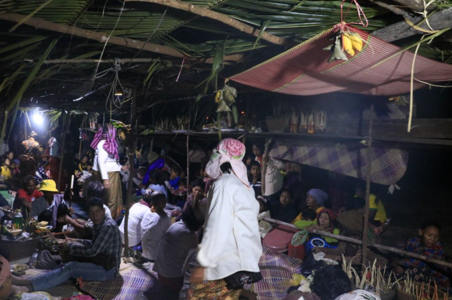 កិច្ចឡើង​មាឃនៅភូមិក្បាលដំរី គេគ្រាន់តែសែន​បាយសម្លរ​ នំបញ្ចុក នំ​កប់ស្ករ នំអន្សម​ក្បុង​ និង​សែន​ស្រូវ​ប៉ុណ្ណោះ។ បន្ទាប់ពីសែនរួច​ ចាប់ពីពេលព្រលប់ទៅគេធ្វើ​ពិធី​លៀងមេមត់ប្រចាំឆ្នាំ​នៅ​តាម​ក្រុមផ្ទះប្រហែល​ពីរបីកន្លែង​ រហូតម៉ោង​ទៀបភ្លឺចប់ក៏​មាន​។ សូមបញ្ជាក់ថា “មេមត់” ជាខ្មោចជួរចំបួរប្រចាំ​ត្រកូល ហើយមាន “រូបស្នង” ដែលភាគច្រើនជាមនុស្សស្រី។ “រូបស្នង” ដើរតួនាទីសំខាន់ក្នុងកិច្ចបញ្ជាន់មេមត់រកហេតុនៃវិបត្តិតូចធំ ដែលកើតឡើងផ្ទាល់ខ្លួន ឬក្នុងគ្រួសារ ឬតាមការពឹងពរពីអ្នកស្រុកជិតឆ្ងាយឱ្យជួយព្យាបាល ស្តោះផ្លុំ ឬរកទ្រព្យ​របស់​ដែល​​បាត់​។