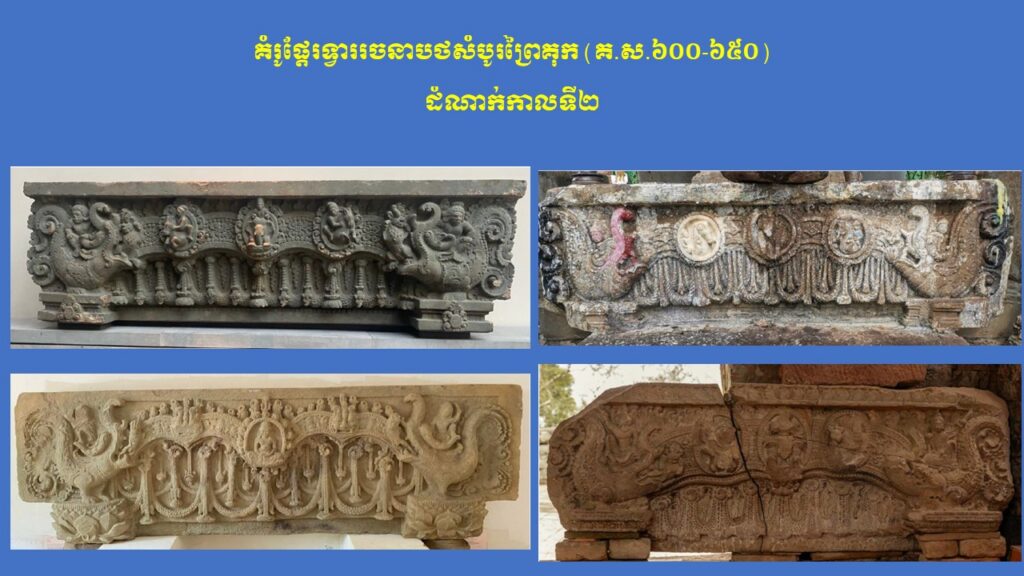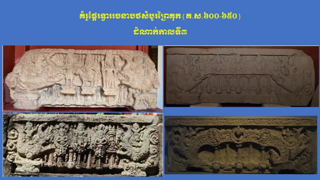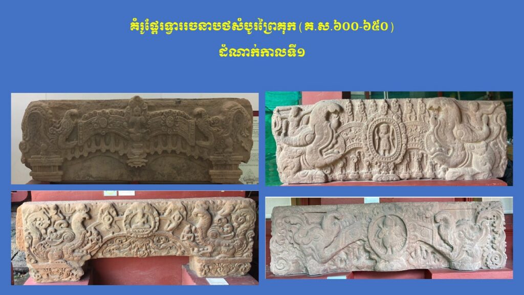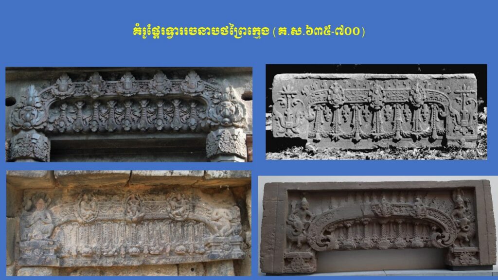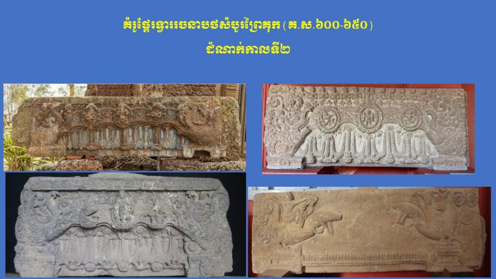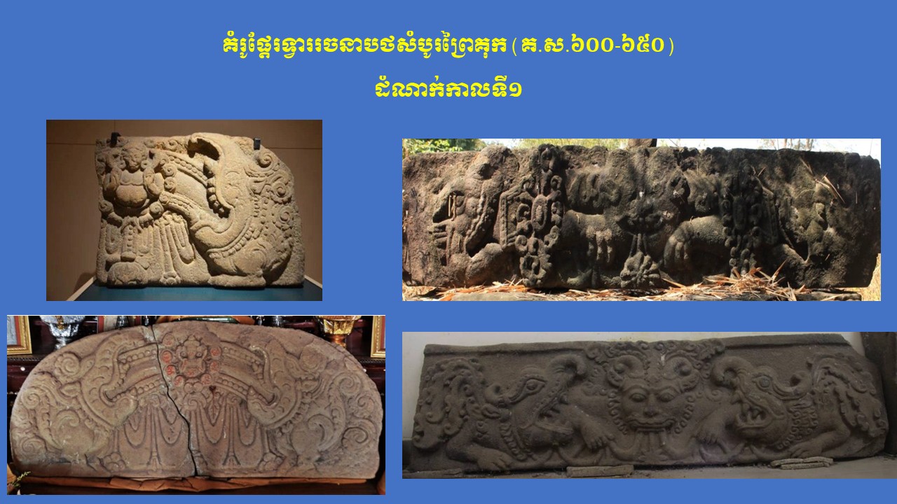 នៅក្នុងភាគទី១នេះ យើងសូមក្រឡេកមកមើលក្បាច់លម្អ និងការវិវឌ្ឍនៃផ្តែរទ្វារនៅសម័យមុនអង្គរ (ស.វ.ទី៧-៨) ជាមុនសិន ដែលមានសរុបចំនួន ៣ រចនាបថ រួមមាន សំបូរព្រៃគុក ព្រៃក្មេង និងកំពង់ព្រះ រីឯរចនាបថភ្នំដាដែលជារចនាបថដំបូងនោះពុំមានផ្តែរទ្វារសម្រាប់សិក្សានោះទេ។ ក្នុងនោះ លោក Jean Boisselier បានកំណត់សិល្បៈរចនាបថសំបូរព្រៃគុកមានអាយុកាលចាប់ពីគ.ស.៦០០ ដល់គ.ស.៦៥០ ពោល គឺត្រូវនឹងរជ្ជកាលព្រះបាទភវវរ្ម័នទី១ (គ.ស.៥៩៨-៦០៦) រហូតដល់រជ្ជកាលព្រះបាទភវវរ្ម័នទី២ (គ.ស.៦៣៧-៦៥៧)។ គួរកត់សម្គាល់ជាពិសេស ការសិក្សាថ្មីមួយរបស់លោកស្រី តៅ ម៉ារ៉ាឌី នាឆ្នាំ២០២៤នេះ បានបែងចែកផ្តែរទ្វាររចនាបថសំបូរព្រៃគុកជា ៣ ដំណាក់កាលសំខាន់ៗ។ ដំណាក់កាលទី១ លោកស្រីហៅថា “ការចាប់ផ្តើមដំបូងនៃផ្តែរទ្វាររចនាបថសំបូរព្រៃគុក” សំដៅដល់ផ្តែរទ្វារមានទម្រង់ជាទូទៅដូចហោជាងនៅតាមសំណង់នានានៅក្នុងស្រុកឥណ្ឌា ហើយផ្តែរទាំងនេះមានក្បាច់លម្អមួយចំនួនគឺទទួលឥទ្ធិពលពីសិល្បៈឥណ្ឌា នាសម័យគុប្ត ស្របទៅតាមការសិក្សាលម្អិតរបស់លោកស្រី Mireille Bénisti ។ ផ្តែរទ្វារនៅដំណាក់កាលទី១ នៃរចនាបថសំបូរព្រៃគុក គឺច្រើនសាងឡើងនៅរវាងដើមស.វ.ទី៧ ដែលគេប្រទះឃើញនៅតំបន់ថាឡាបរិវ៉ាត់ (ខេត្តស្ទឹងត្រែង) ផ្នែកខ្លះនៃខេត្តក្រចេះ ផ្នែកខ្លះនៃខេត្តកំពង់ចាម ផ្នែកខ្លះនៃខេត្តកំពត តំបន់វត្តភូ (ស្រុកលាវ) និងតំបន់ប៉ែកឦសានប្រទេសសៀម។ ផ្តែរទាំងនោះ ច្រើនរំលេចដោយរូបសត្វមករធំៗនៅសងខាង ខ្ជាក់ឬលេបក្បាច់អង្កត់ធ្នូ នៅចំពាក់កណ្តាលជារូបកិត៌ិមុខ (រាហូ) ឬរូបសត្វគ្រុឌចាប់នាគ ឬជួនកាលមានរូបទេពជាដើម (ឧទាហរណ៍ រូបព្រះនាងលក្ស្មីកាន់ផ្កាឈូក) ហើយនៅផ្នែកខាងក្រោមច្រើនរំលេចជាចង្វាយក្បាច់រំយោលផ្កា ឬកម្រងមាលាឆ្លាស់គ្នា (រូបលេខ១-២)។ ដំណាក់កាលទី២ លោកស្រីហៅថា “ដំណាក់កាលកណ្តាលនៃ ផ្តែរទ្វាររចនាបថសំបូរព្រៃគុក” ដែលភាគច្រើនជាសិល្បៈសាងសង់ឡើងនៅដើមរជ្ជកាលព្រះបាទឦសានវរ្ម័នទី១ (គ.ស.៦១៦-៦៣៧) និងមានការវិវឌ្ឍបន្តពីដំណាក់កាលទី១។ ផ្តែរទ្វារទាំងនោះ បង្ហាញឡើងដោយមានសត្វមករទំហំតូចៗនៅខាងចុង បែរមុខចូលក្នុងខ្ជាក់ឬលេបក្បាច់អង្កត់ធ្នូ ដែលមានរាងកោងជា ៣ របត់ ហើយគ្រប់របត់មានចម្លាក់រាងរង្វង់ (មេដាយ៉ុង) រំលេចដោយរូបទេព ឬសត្វទេវកថាផ្សេងៗ ហើយនៅខាងក្រោមជារំយោលផ្កា និងកម្រងមាលាឆ្លាស់គ្នា។ រូបទេពដែលគេនិយមជាងគេ គឺព្រះឥន្រ្ទគង់នៅលើដំរីព្ធវ៌តនៅចំកណ្តាល អមសងខាងដោយព្រះមរុតជិះសេះ (មរុតជាកងទ័ពខ្យល់របស់ព្រះឥន្រ្ទនៅស្ថានសួគ៌)។ ក្រៅអំពីរូបព្រះឥន្រ្ទជិះដំរីព្ធវ៌ត មានផ្តែរខ្លះទៀតមានរំលេចរូបចម្លាក់ព្រះឥសូរជិះតោ ព្រះឥសូរជិះគោ ព្រះឥសូរធ្វើយោគិ (យោគិស្វរ) ព្រះយមជិះសត្វក្របី និងខ្លះទៀតបង្ហាញជារូបសត្វទេវកថ