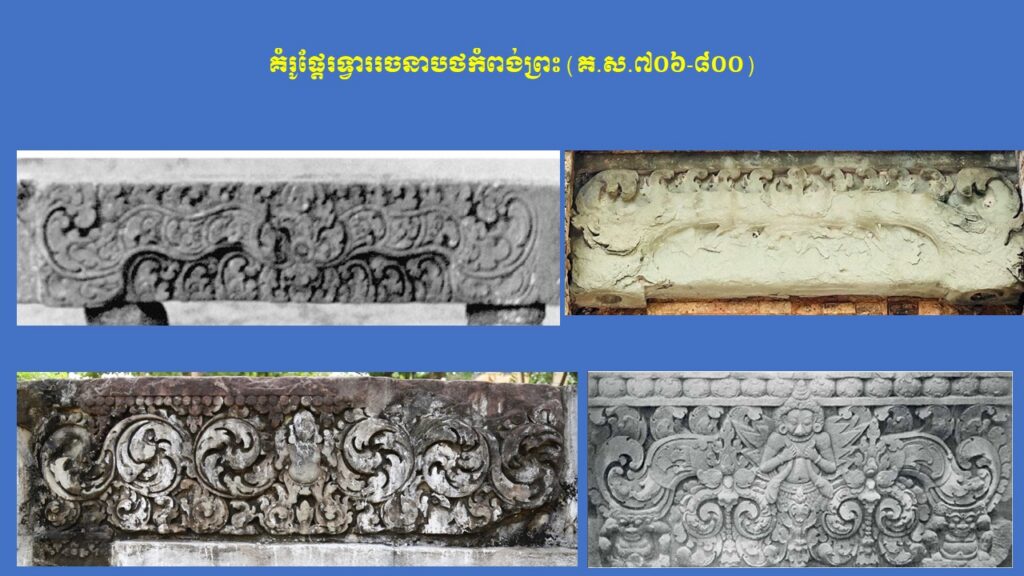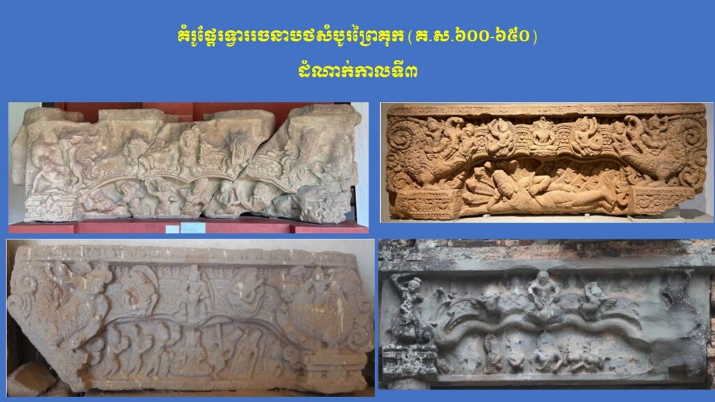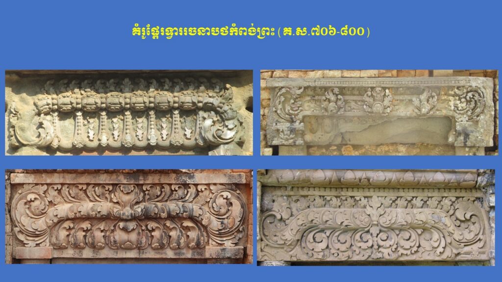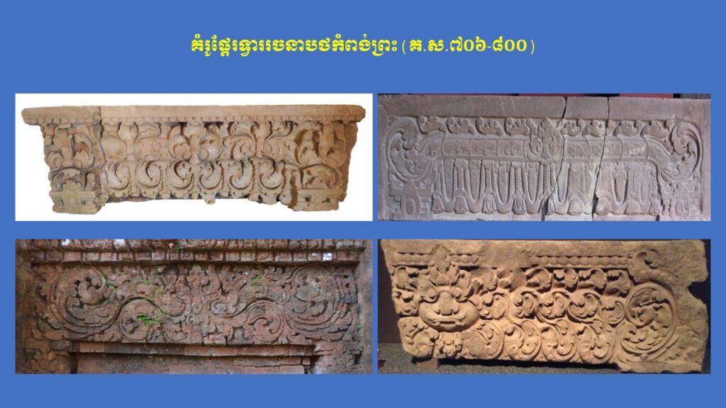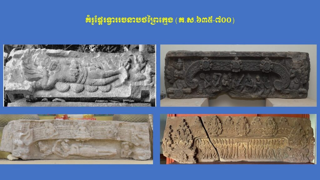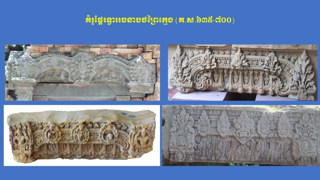 នៅក្នុងភាគទី១នេះ យើងសូមក្រឡេកមកមើលក្បាច់លម្អ និងការវិវឌ្ឍនៃផ្តែរទ្វារនៅសម័យមុនអង្គរ (ស.វ.ទី៧-៨) ជាមុនសិន ដែលមានសរុបចំនួន ៣ រចនាបថ រួមមាន សំបូរព្រៃគុក ព្រៃក្មេង និងកំពង់ព្រះ រីឯរចនាបថភ្នំដាដែលជារចនាបថដំបូងនោះពុំមានផ្តែរទ្វារសម្រាប់សិក្សានោះទេ។ ក្នុងនោះ លោក Jean Boisselier បានកំណត់សិល្បៈរចនាបថសំបូរព្រៃគុកមានអាយុកាលចាប់ពីគ.ស.៦០០ ដល់គ.ស.៦៥០ ពោល គឺត្រូវនឹងរជ្ជកាលព្រះបាទភវវរ្ម័នទី១ (គ.ស.៥៩៨-៦០៦) រហូតដល់រជ្ជកាលព្រះបាទភវវរ្ម័នទី២ (គ.ស.៦៣៧-៦៥៧)។ គួរកត់សម្គាល់ជាពិសេស ការសិក្សាថ្មីមួយរបស់លោកស្រី តៅ ម៉ារ៉ាឌី នាឆ្នាំ២០២៤នេះ បានបែងចែកផ្តែរទ្វាររចនាបថសំបូរព្រៃគុកជា ៣ ដំណាក់កាលសំខាន់ៗ។ ដំណាក់កាលទី១ លោកស្រីហៅថា “ការចាប់ផ្តើមដំបូងនៃផ្តែរទ្វាររចនាបថសំបូរព្រៃគុក” សំដៅដល់ផ្តែរទ្វារមានទម្រង់ជាទូទៅដូចហោជាងនៅតាមសំណង់នានានៅក្នុងស្រុកឥណ្ឌា ហើយផ្តែរទាំងនេះមានក្បាច់លម្អមួយចំនួនគឺទទួលឥទ្ធិពលពីសិល្បៈឥណ្ឌា នាសម័យគុប្ត ស្របទៅតាមការសិក្សាលម្អិតរបស់លោកស្រី Mireille Bénisti ។ ផ្តែរទ្វារនៅដំណាក់កាលទី១ នៃរចនាបថសំបូរព្រៃគុក គឺច្រើនសាងឡើងនៅរវាងដើមស.វ.ទី៧ ដែលគេប្រទះឃើញនៅតំបន់ថាឡាបរិវ៉ាត់ (ខេត្តស្ទឹងត្រែង) ផ្នែកខ្លះនៃខេត្តក្រចេះ ផ្នែកខ្លះនៃខេត្តកំពង់ចាម ផ្នែកខ្លះនៃខេត្តកំពត តំបន់វត្តភូ (ស្រុកលាវ) និងតំបន់ប៉ែកឦសានប្រទេសសៀម។ ផ្តែរទាំងនោះ ច្រើនរំលេចដោយរូបសត្វមករធំៗនៅសងខាង ខ្ជាក់ឬលេបក្បាច់អង្កត់ធ្នូ នៅចំពាក់កណ្តាលជារូបកិត៌ិមុខ (រាហូ) ឬរូបសត្វគ្រុឌចាប់នាគ ឬជួនកាលមានរូបទេពជាដើម (ឧទាហរណ៍ រូបព្រះនាងលក្ស្មីកាន់ផ្កាឈូក) ហើយនៅផ្នែកខាងក្រោមច្រើនរំលេចជាចង្វាយក្បាច់រំយោលផ្កា ឬកម្រងមាលាឆ្លាស់គ្នា (រូបលេខ១-២)។ ដំណាក់កាលទី២ លោកស្រីហៅថា “ដំណាក់កាលកណ្តាលនៃ ផ្តែរទ្វាររចនាបថសំបូរព្រៃគុក” ដែលភាគច្រើនជាសិល្បៈសាងសង់ឡើងនៅដើមរជ្ជកាលព្រះបាទឦសានវរ្ម័នទី១ (គ.ស.៦១៦-៦៣៧) និងមានការវិវឌ្ឍបន្តពីដំណាក់កាលទី១។ ផ្តែរទ្វារទាំងនោះ បង្ហាញឡើងដោយមានសត្វមករទំហំតូចៗនៅខាងចុង បែរមុខចូលក្នុងខ្ជាក់ឬលេបក្បាច់អង្កត់ធ្នូ ដែលមានរាងកោងជា ៣ របត់ ហើយគ្រប់របត់មានចម្លាក់រាងរង្វង់ (មេដាយ៉ុង) រំលេចដោយរូបទេព ឬសត្វទេវកថាផ្សេងៗ ហើយនៅខាងក្រោមជារំយោលផ្កា និងកម្រងមាលាឆ្លាស់គ្នា។ រូបទេពដែលគេនិយមជាងគេ គឺព្រះឥន្រ្ទគង់នៅលើដំរីព្ធវ៌តនៅចំកណ្តាល អមសងខាងដោយព្រះមរុតជិះសេះ (មរុតជាកងទ័ពខ្យល់របស់ព្រះឥន្រ្ទនៅស្ថានសួគ៌)។ ក្រៅអំពីរូបព្រះឥន្រ្ទជិះដំរីព្ធវ៌ត មានផ្តែរខ្លះទៀតមានរំលេចរូបចម្លាក់ព្រះឥសូរជិះតោ ព្រះឥសូរជិះគោ ព្រះឥសូរធ្វើយោគិ (យោគិស្វរ) ព្រះយមជិះសត្វក្របី និងខ្លះទៀតបង្ហាញជារូបសត្វទេវកថ