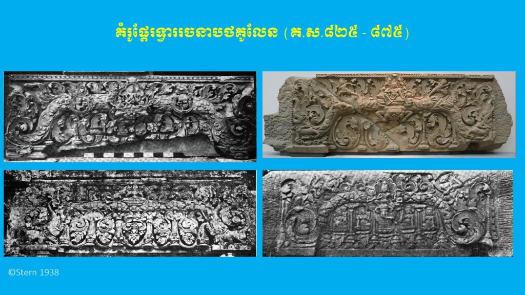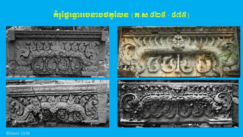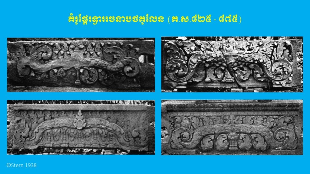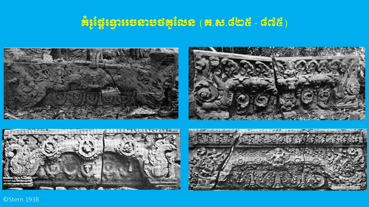រចនាបថដំបូងនៃសម័យអង្គរ គេស្គាល់ជាទូទៅថា “រចនាបគូលែន” ដែលលោក Jean Boisselier បានកំណត់គិតចាប់ពីគ.ស.៨២៥ – ៨៧៥។ ប៉ុន្តែ អ្វីដែលគួរឱ្យកត់សម្គាល់ នៅក្នុងរចនាបថគូលែន លោកបានប្រើពាក្យថា “Transition”ប្រែថា “អន្តរកាល” ពោល គឺលោកចង់បញ្ជាក់ឱ្យដឹងថារចនាបថនេះ គឺជាចំណុចរបត់ដ៏ធំមួយដែលភ្ជាប់រវាងសិល្បៈសម័យមុនអង្គរទៅកាន់សិល្បៈសម័យអង្គរ។ បន្ថែមពីនេះ នៅសម័យនោះ សិល្បករខ្មែរចាប់ផ្តើមបោះបង់ចោលនូវឥទ្ធិពលសិល្បៈឥណ្ឌាខ្លៗ ហើយចាប់ផ្តើមបង្កើតជាអត្តសញ្ញាណថ្មីមួយជារបស់ខ្លួន។ ការសិក្សាដ៏លម្អិតអំពីផ្តែរទ្វាររចនាបថគូលែនដំបូងគេ គឺគេមិនអាចបំភ្លេចស្នាដៃរបស់លោក Philippe Stern បានឡើយ ដែលអត្ថបទរបស់លោកមានចំណងជើងថា “Le Style du Kulên (décor architectural et statuaire” (រចនាបថគូលែន គ្រឿងលម្អស្ថាបត្យកម្ម និងបដិមា) ចុះផ្សាយនៅក្នុងព្រឹត្តិបត្រសាលាបារាំងចុងបូព៌ាប្រទេស ឆ្នាំ១៩៣៨ ពោល គឺមុនកាលបរិច្ឆេទដែលលោក Jean Boisselier បានកំណត់នៅក្នុងឆ្នាំ១៩៦៦។ លោក Stern បានកត់សម្គាល់ចំណុចសំខាន់ៗចំនួន ៤ អំពីផ្តែរទ្វារសិល្បៈគូលែន។ ក្នុងនោះ ចំណុចទី១ គឺការប្តូររាងក្បាច់បន្ទាត់ធ្នូដែលមានរាងកោង មកជារាងរាបស្មើជាងមុន រីឯដងខ្លួនក្បាច់បន្ទាត់ធ្នូក៏លែងមានរាងស៊ីឡាំងទៀតដែរ គឺប្តូរមកជាមានលក្ខណៈសំប៉ែត និងមានក្បាច់លម្អគ្របពីលើស្ទើរតែទាំងស្រុង។ ចំណុចទី២ គឺវត្តមាននៃចម្លាក់សត្វមករនៅចុងសងខាងនៃផ្តែរទ្វារបានត្រឡប់មកវិញម្តងទៀត បន្ទាប់ពីបាត់នៅរចនាបថព្រៃក្មេង និងកំពង់ព្រះ តែភាគច្រើនសត្វមករបែរមុខចេញក្រៅ ខុសពីនៅរចនាបថសំបូរព្រៃគុកដែលច្រើនបែរមុខចូលក្នុង។ ចំណុចទី៣ គឺសិល្បករនិយមលម្អរូបព្រះកាលនៅចំពាក់កណ្តាលផ្តែរ ដែលខ្ជាក់ចេញនូវក្បាច់មែកឈើទៅសងខាង ហើយការលម្អក្បាច់ស្លឹកឈើគឺរស់រវើកនិងក្រាស់ជាងមុន។ ចំណុចទី៤ចុងក្រោយ គឺលោកបានគិតថា សិល្បៈផ្តែរទ្វាររចនាបថគូលែន មានលក្ខណៈស្រដៀងសិល្បៈជ្វា ត្រង់ចំណុចការឆ្លាក់រូប “កាល-មករ” (Kāla – Makara)។