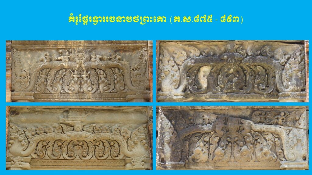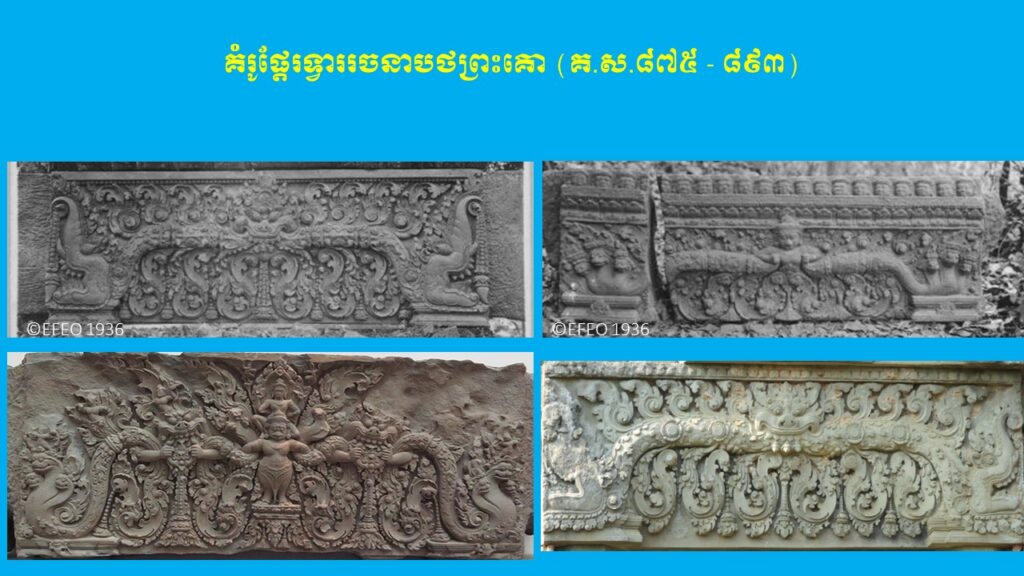 ចូលមកដល់រចនាបថព្រះគោ (គ.ស.៨៧៥ – ៨៩៣) ដែលជាសិល្បៈស្ថិតនៅក្នុងរជ្ជកាលព្រះបាទស្រីឥន្រ្ទវរ្ម័នទី១ និងព្រះបាទស្រីយសោវរ្ម័នទី១ និងជារចនាបថដែលអ្នកប្រវត្តិសិល្បៈវិទូជាច្រើនយល់ស្របថាជាពេលសិល្បៈខ្មែរមានភាពជាខ្លួនឯងទាំងស្រុង ពោល គឺស្ទើរតែលែងមានឥទ្ធិពលអារ្យធម៌ឥណ្ឌាទៀតហើយ។ ការសិក្សាដ៏លម្អិតអំពីផ្តែរទ្វាររចនាបថព្រះគោដំបូងគេ គឺគេមិនអាចបំភ្លេចស្នាដៃរបស់លោក Henri Parmentier បានឡើយ ដែលអត្ថបទរបស់លោកមានចំណងជើងថា “L’art d’Indravarman” (សិល្បៈព្រះបាទស្រីឥន្រ្ទវរ្ម័ន) ចុះផ្សាយនៅក្នុងព្រឹត្តិបត្រសាលាបារាំងចុងបូព៌ាប្រទេស ឆ្នាំ១៩១៩។ លោក Parmentier យល់ថា ផ្តែរទ្វារក្នុងរជ្ជកាលព្រះបាទស្រីឥន្រ្ទវរ្ម័នទី១ គឺជាការរួមបញ្ចូលគ្នាយ៉ាងឥតខ្ចោះរវាង “សត្វទេវកថា” និង “ធម្មជាតិ” ដែលជាសិល្បៈមានសណ្តាប់ធ្នាប់ (ស៊ីមេទ្រី) និងមានភាពរស់រវើកបំផុត បើធៀបជាមួយនឹងរចនាបថមុនៗ។ ក្នុងនោះ លោកបានកត់សម្គាល់ចំណុចសំខាន់ៗចំនួន ៥ ចំណុច។ ចំណុចទី១ គឺផ្តែរទ្វាររចនាបថព្រះគោ មានភាពសម្បូណ៌បែប និងការតុបតែងពេញផ្ទៃនៃផ្តែរទ្វារ ដែលជាវិវឌ្ឍខ្លាំងពីភាពសាមញ្ញនៅសម័យមុន តាមរយៈការឆ្លាក់ក្បាច់យ៉ាងហ្មត់ចត់ ស្ទើរតែគ្មានចន្លោះទំនេរ និងការរួមបញ្ចូលគ្នារវាងចម្លាក់សត្វទេវកថា ទេវតា និងក្បាច់រុក្ខជាតិយ៉ាងរស់រវើក។ ចំណុចទី២ គឺរូបរាងនៃដងធ្នូមានរាងផ្តេក សណ្ឋានរាបស្មើ និងរលកតិចៗជាជួរដេក ដែលផ្ទុយពីសម័យមុនមានរាងកោង និងប៉ោងខ្លាំង។ ចំណុចទី៣ គឺការរំលេចនិម្មិតរូប “ព្រះកាល” និង “សត្វមករ” ដ៏លេចធ្លោបំផុត ពោល គឺព្រះកាលឆ្លាក់នៅចំកណ្តាលផ្តែរ ខ្ជាក់ចេញនូវមែកធាងផ្កាភ្ញីទៅសងខាង ហើយជួនកាលមានរូបទេវតាតូចៗ ឬគ្រុឌជិះពីលើព្រះកាល ឬរាហូនេះ។ រីឯសត្វមករ ឆ្លាក់នៅចុងសងខាងផ្តែរ បែរមុខចេញក្រៅខ្ជាក់ចេញនូវក្បាច់ផ្កាភ្ញី ឬរូបនាគ ហើយនៅលើខ្នងសត្វមករជារឿយៗមានរូបអ្នកចម្បាំងកាន់ធ្នូ ឬអាវុធជិះពីលើ។ ចំណុចទី៤ លោកកត់សម្គាល់អំពី “ការប្រើប្រាស់រូបសត្វចម្រុះ” ពោល គឺរចនាបថព្រះគោ មិនត្រឹមតែឆ្លាក់តែរូបសត្វមករមួយមុខទេ តែគេបានឆ្លាក់សត្វទេវកថាជាច្រើនទៀតដូចជា គជសីហ៍ នាគក្បាលបីឬប្រាំ ដំរីមានស្លាប និងសេះ។ ចំណុចទី៥ ចុងក្រោយ លោកកត់សម្គាល់លើក្បាច់ស្លឹកឈើ ឬផ្កាភ្ញីស្ថិតនៅខាងក្រោមដងធ្នូ មានលក្ខណៈជាកង់ៗ ឬជាផ្ទាំងៗ ដែលក្បាច់នេះជួយបង្កើនសោភ័ណភាពឱ្យផ្តែរមើលទៅកាន់តែធំ និងអស្ចារ្យ។